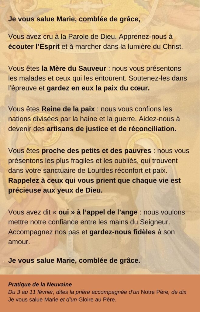 « Je vous salue, Marie, comblée de grâce. » Durant neuf jours, du 3 au 11 février, nous voulons confier nos vies, nos familles, ceux que nous aimons et tous ceux qui souffrent à la tendresse de la Vierge Marie.